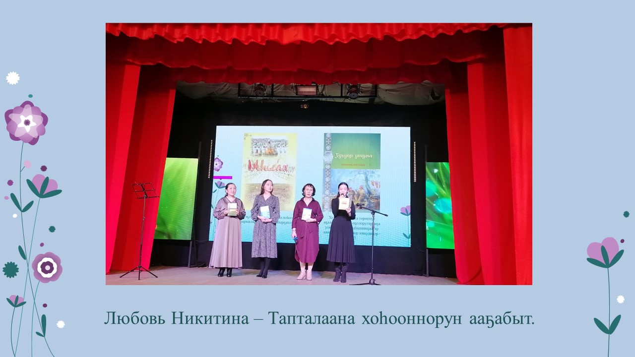 Уонна бу дьоро ырыа киэһитин ыытаары, доҕотторун, бииргэ ыллыыр дьонун түмэн, дойдутугар үтүө санаатынан ыалдьыттыы, хоһоон, ырыа, кинигэ бэлэх тутан тиийэн кэлбит Любовь Федотовна Никитина-Тапталаана, үлэ бэтирээнэ, хас даҕаны кинигэ автора ,,Истиий дуу, байааным бырайыак кыттыылааҕа, 3 көлүөнэ оскуола курсиската, Раиса Николаевна Тимофеева-Николаева салайааччылаах ,,Уран тыл оһуора» литературнай түмсүү чилиэнэ, Александров Иван Парфеньевич сал. Саха өрөспүүбүлүкэтин көҥүл,,Ситим» суруйааччыларын сойууһун чилиэнэ, Корякина Римма Николаевна- Хотууна сал. Чурапчы улууһун литературнай түмсүүтүн чилиэнэ. Элбэх оҕолоох ыал ийэтэ, эбээтэ, куруук үөрэ-көтө көрсөр убаастыыр киһибит, айар үлэтин билиһиннэрэ кэллэ.