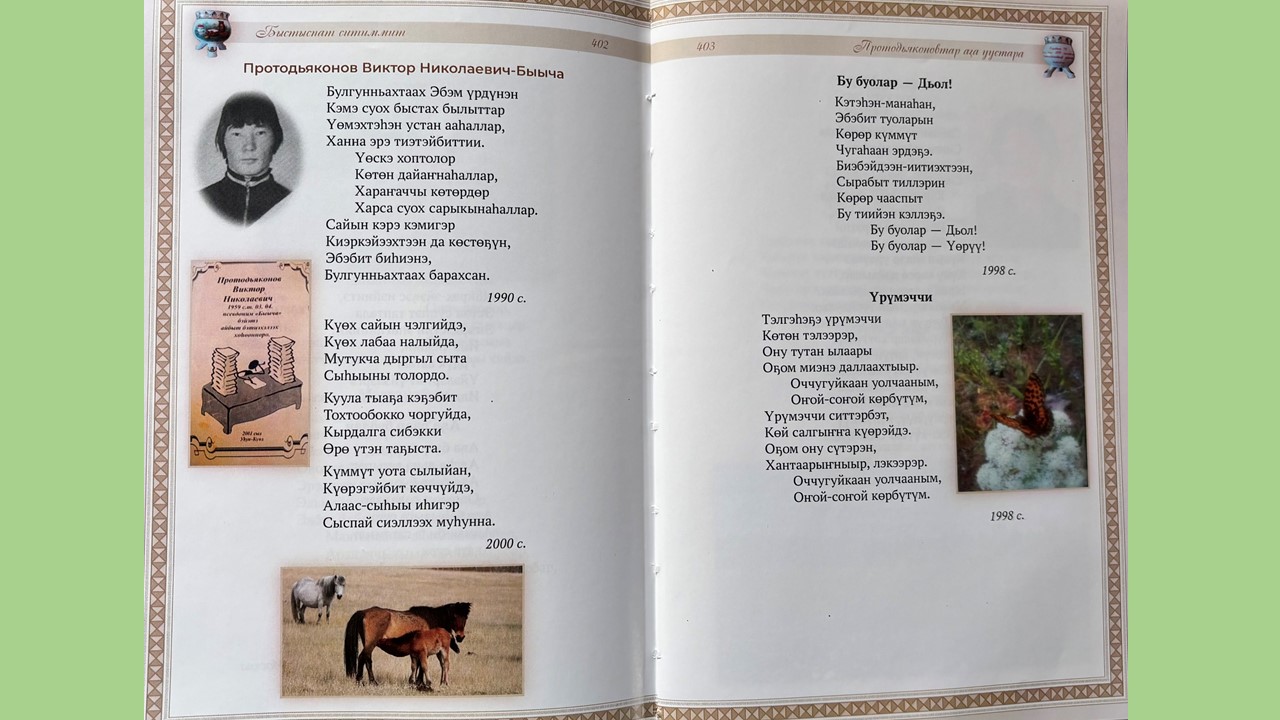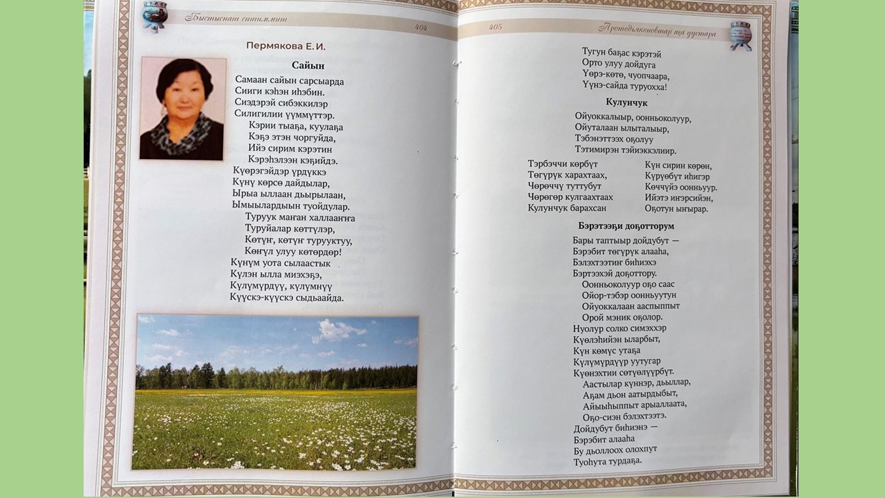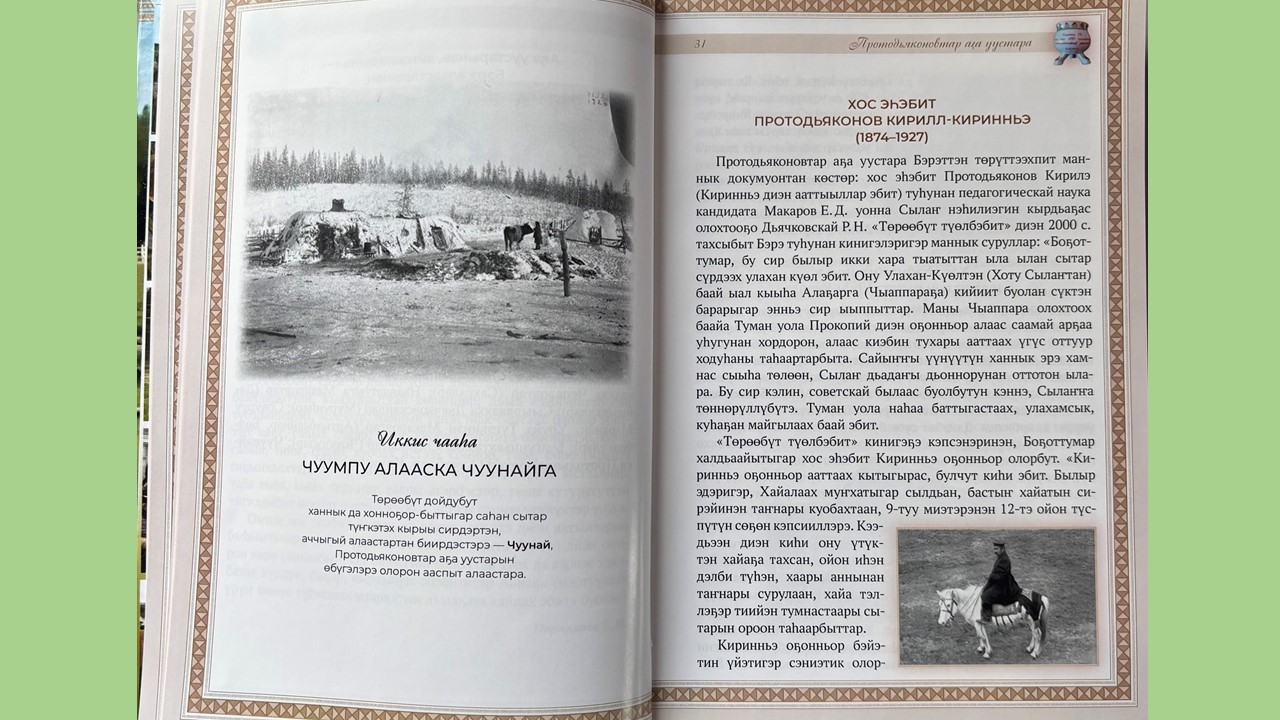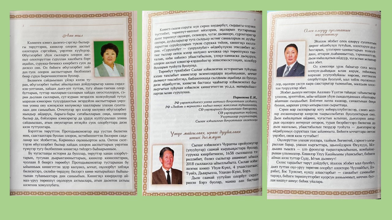 Киирии тылы : үс киһи суруйбут : бу кинигэни түмэн, хомуйан таһаартарбыт Евдокия Иннокентьевна Пермякова, Сылаҥ нэһилиэгин ытык киһитэ Борис Пахомович уонна Анатолия Николаевия Софронов, 19 сиэннэрэ диэн суруллубут. Бу тыл киэҥ аймах төрүччүтэ ырытыллыбытын көрдөрөр дии санааҕа кэлбитим.