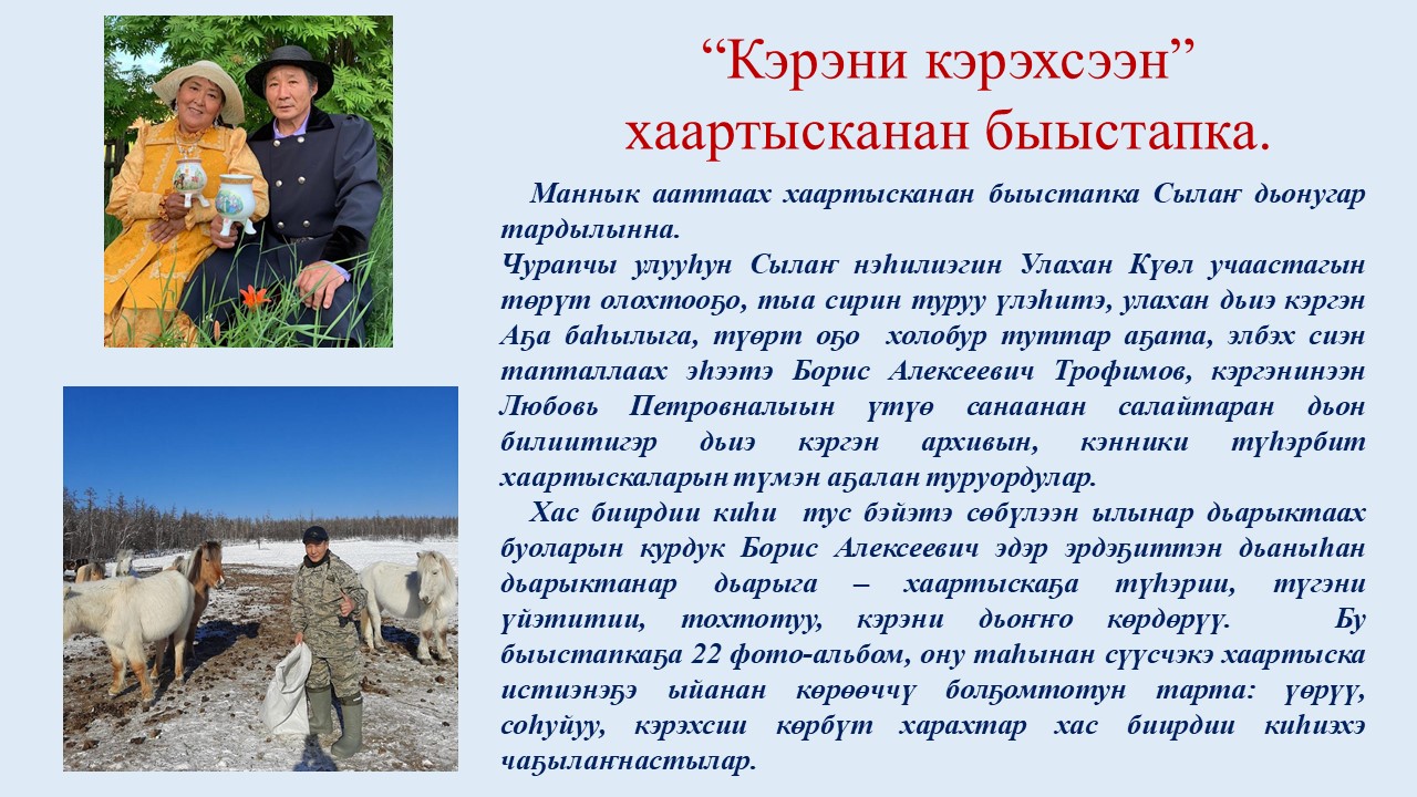 Дьону тардар, сэргэхситэр, кэпсиир хаартыскалар быыстапка буолан Сылаҥҥа балаҕаҥҥа тардылынна. Бу үлэлэри хаартысканан үлэһийэн түһэрэр, оҥорор, түмэр, мунньар дьарыктаах Трофимов Борис Алексеевич буолар. Барыта 22 альбом уонна элбэх истиэнэҕэ хаартыска ыйанна. Хас биирдии альбом ааттаах-суоллаах, олус кичэллээхтик сааһыламмыт, суруктаах, быһаарыылаах. Бэйэтэ ураты коллекция буолар.
