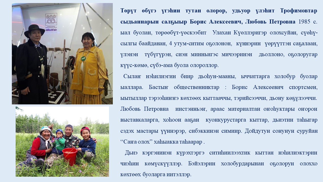 Маны тэрийбит Борис Алексеевичка, Любовь Петровнаҕа, кийииттэригэр Саргылана Дмитриевнаҕа улахан Махталбытын тиэрдэбит! Эһиги дьиэ кэргэҥҥэ бары үтүөнү, сырдыгы, чэгиэн доруобуйаны, дьоллоох олоҕу баҕарабыт!